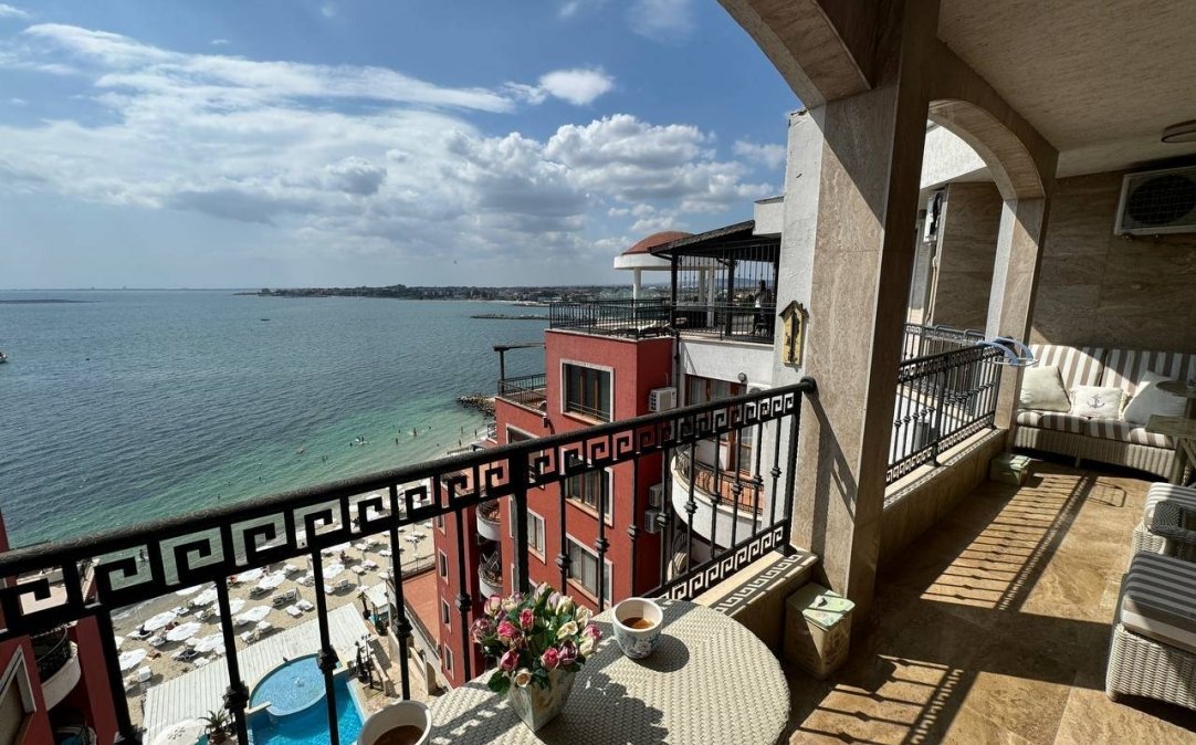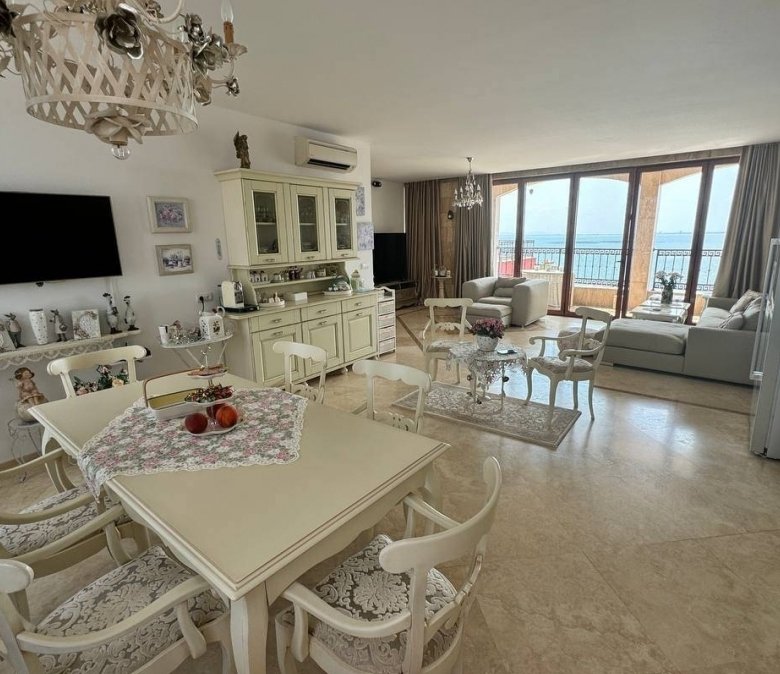 Exceptional two-bedroom apartment in the elite Rich Complex, located directly on the seafront in Nessebar. Spacious (182.6 m²) and elegantly designed in Provence style with high-quality finishes, Italian furniture, and full equipment – all included in the price.